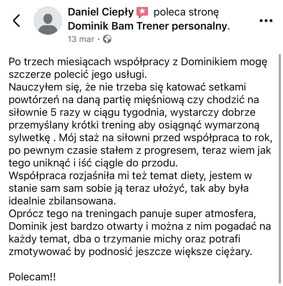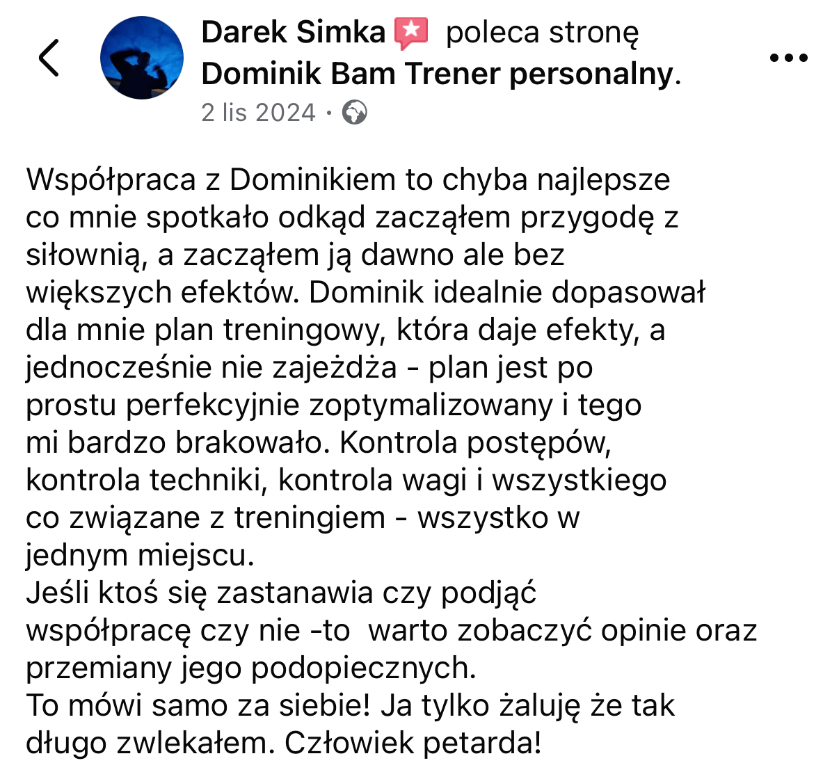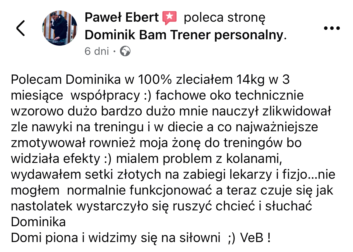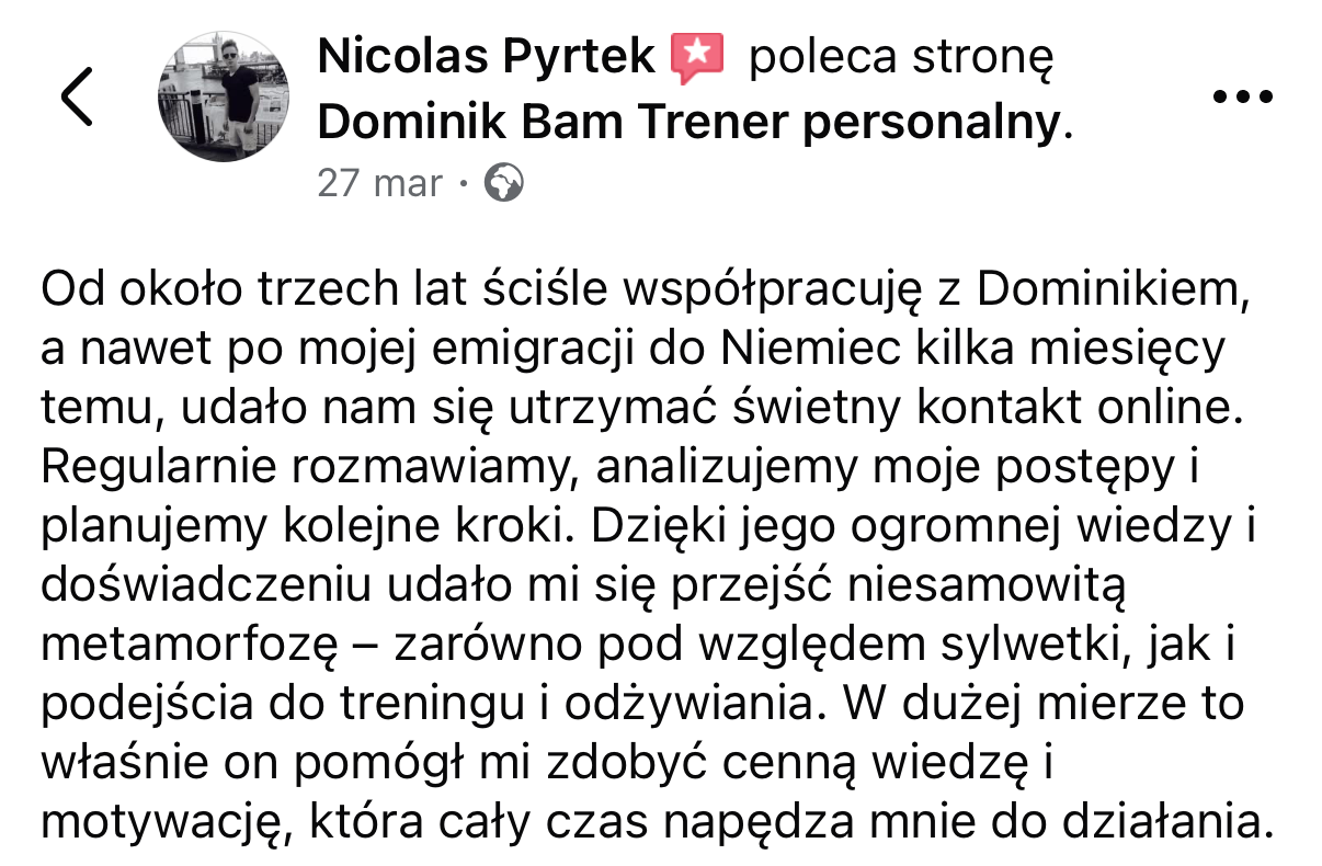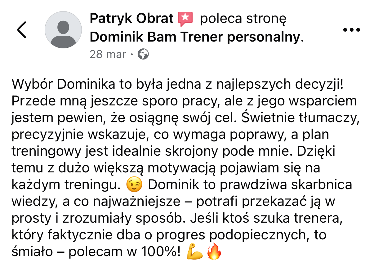 Wszystkie opinie i historie sukcesu przedstawione na tej stronie pochodzą od prawdziwych klientów. Przedstawione rezultaty nie są gwarancją podobnych efektów u innych osób. Rezultaty zależą od wielu czynników, w tym od zaangażowania, regularności, indywidualnych predyspozycji, stanu zdrowia oraz przestrzegania zaleceń treningowych i/lub dietetycznych.
